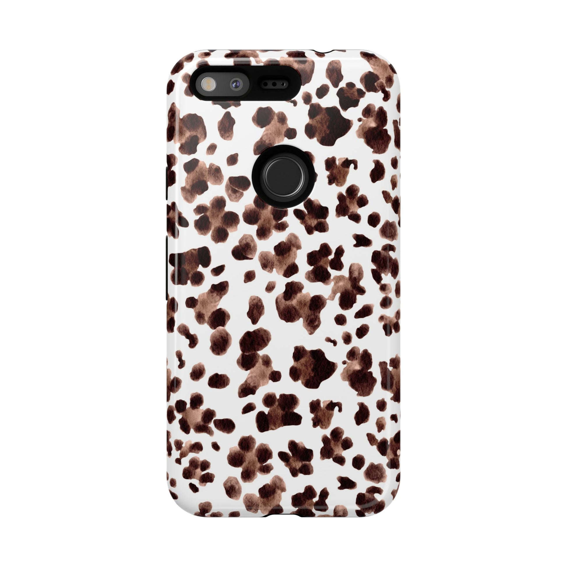 A slim, protective phone case patterned with soft, watercolor-style brown spots on a clean white background — an elevated take on a classic animal-print look. The dual-layer polycarbonate shell and TPU silicone liner give grounded shock absorption and impact resistance while maintaining a sleek profile that slips easily into a pocket or bag. The image is printed with full 3D wrap for continuous coverage and UV protection to keep colors vivid outdoors. Clear port openings and wireless charging compatibility keep everyday use effortless. This case brings an organic, artful vibe to daily carry: tactile comfort where protection meets a quietly expressive aesthetic.