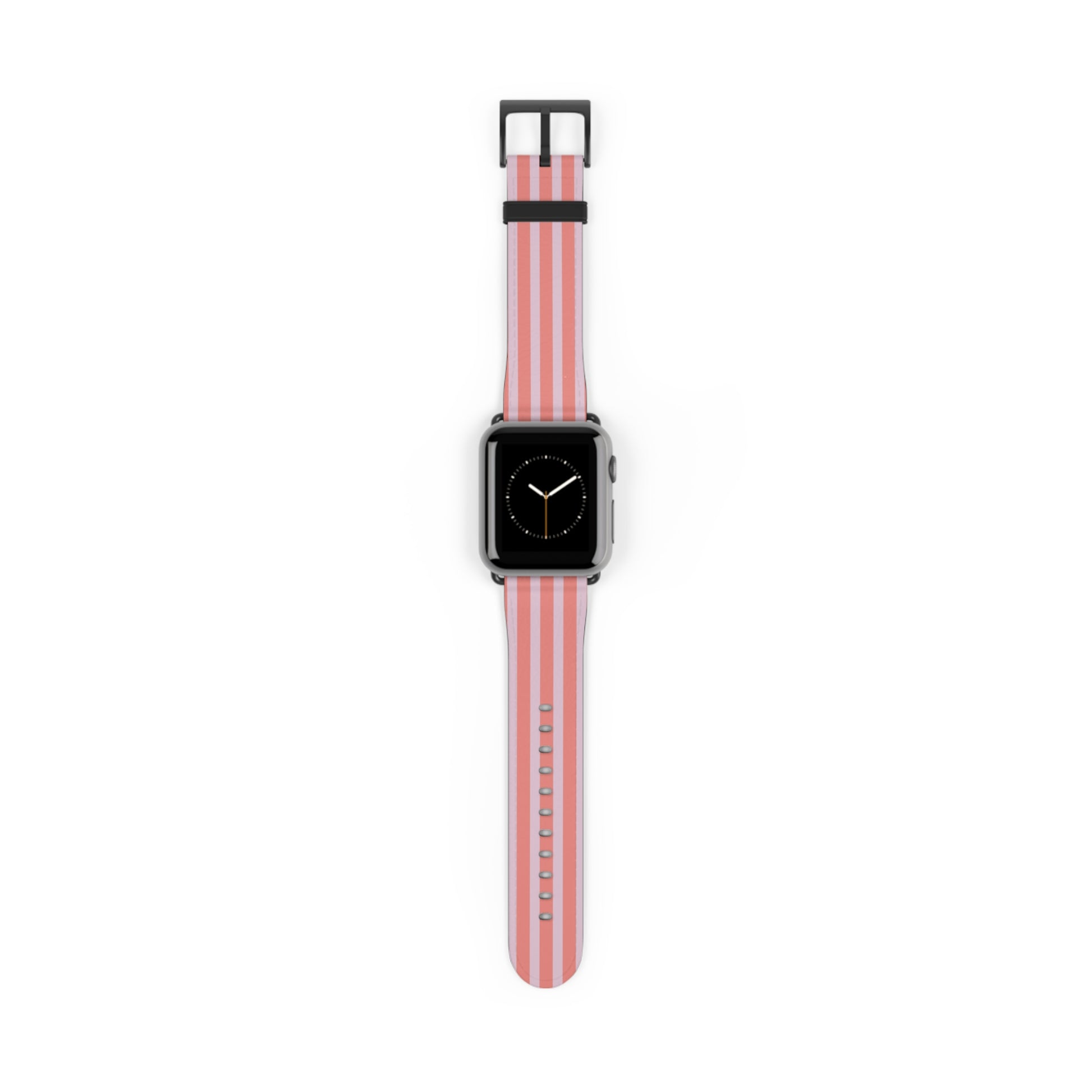 A soft-feel faux leather watch band with a cheerful stripe motif that brings a subtle, joyful pop to your daily routine. Lightweight and durable, the band slips into Apple Watch adapters and secures with a stainless steel buckle for reliable wear. The warm coral and pale pink stripes add a casual, handcrafted vibe — great for moments when you want a little color on your wrist without shouting. Wear it for weekend strolls, coffee dates, or when you want a bright accent while running errands. The printed finish keeps the design crisp and wearable day after day.